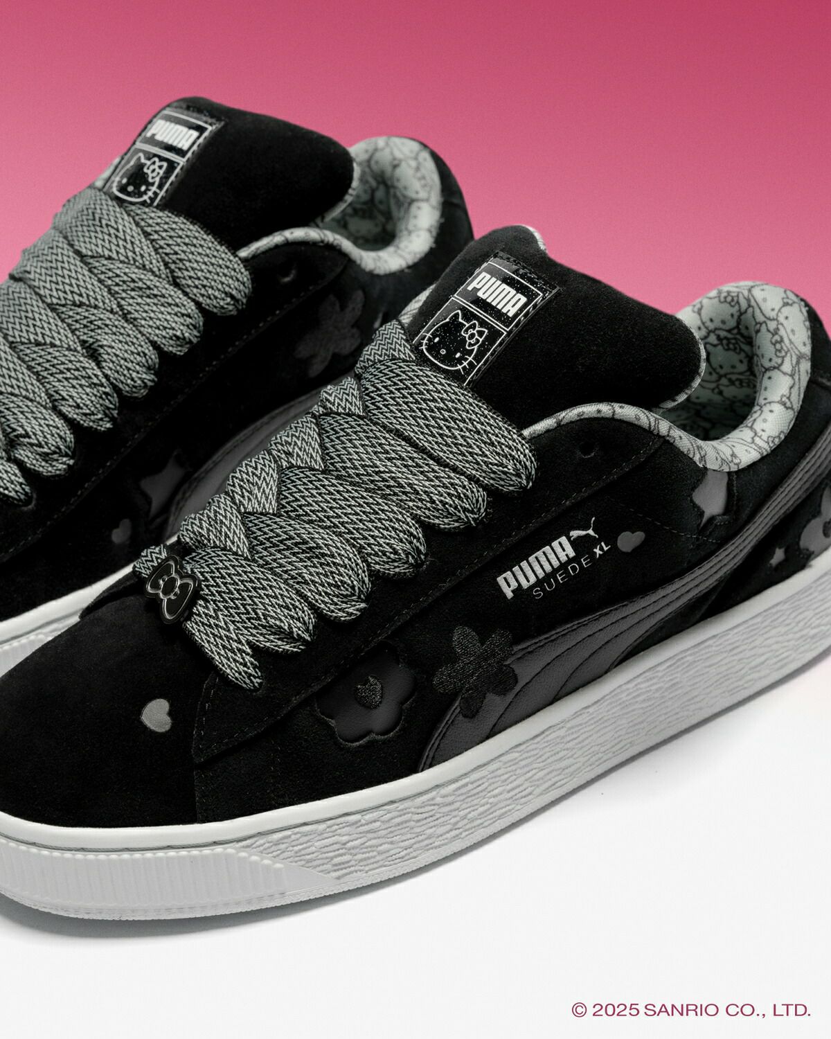 PUMA×ハローキティアンドフレンズコレクションのスペシャルなコラボレーションモデルが登場。 肉厚なパッド入りシュータンとボリューム感のあるソールが特徴的な"スウェードXL"をベースに、2000年代テイストの心弾むバブルガム・ポップからのインスピレーションを多く取り入れ、ハローキティのキュートで遊び心ある世界観を表現したコラボレーションモデルならではの1足に仕上がっています。